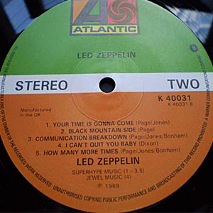Just acquired this very nice copy of Led Zeppelin’s debut LP. This is the 3rd UK pressing and the first issue on the green and orange Atlantic labels (the first two editions being the Turquoise sleeve with Superhype publishing credits and the orange sleeve with Warner publishing credits, both on ‘red/plum’ labels).