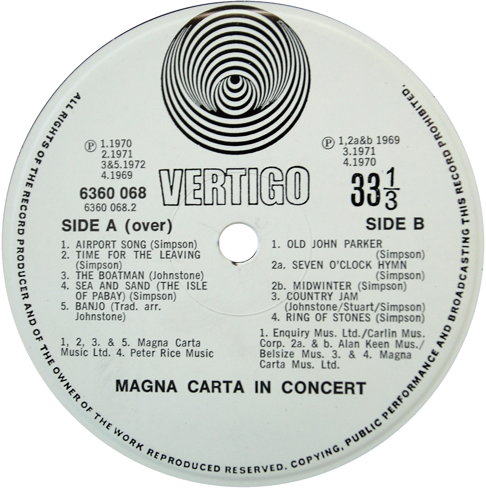 Newly discovered label variation on Magna Carta’s live album on Vertigo swirl. ‘In Concert’ with the catalogue number 6360 068 has two issues on Vertigo swirl, even the long-established fan-site vertigo swirl.com has not published this label variation…