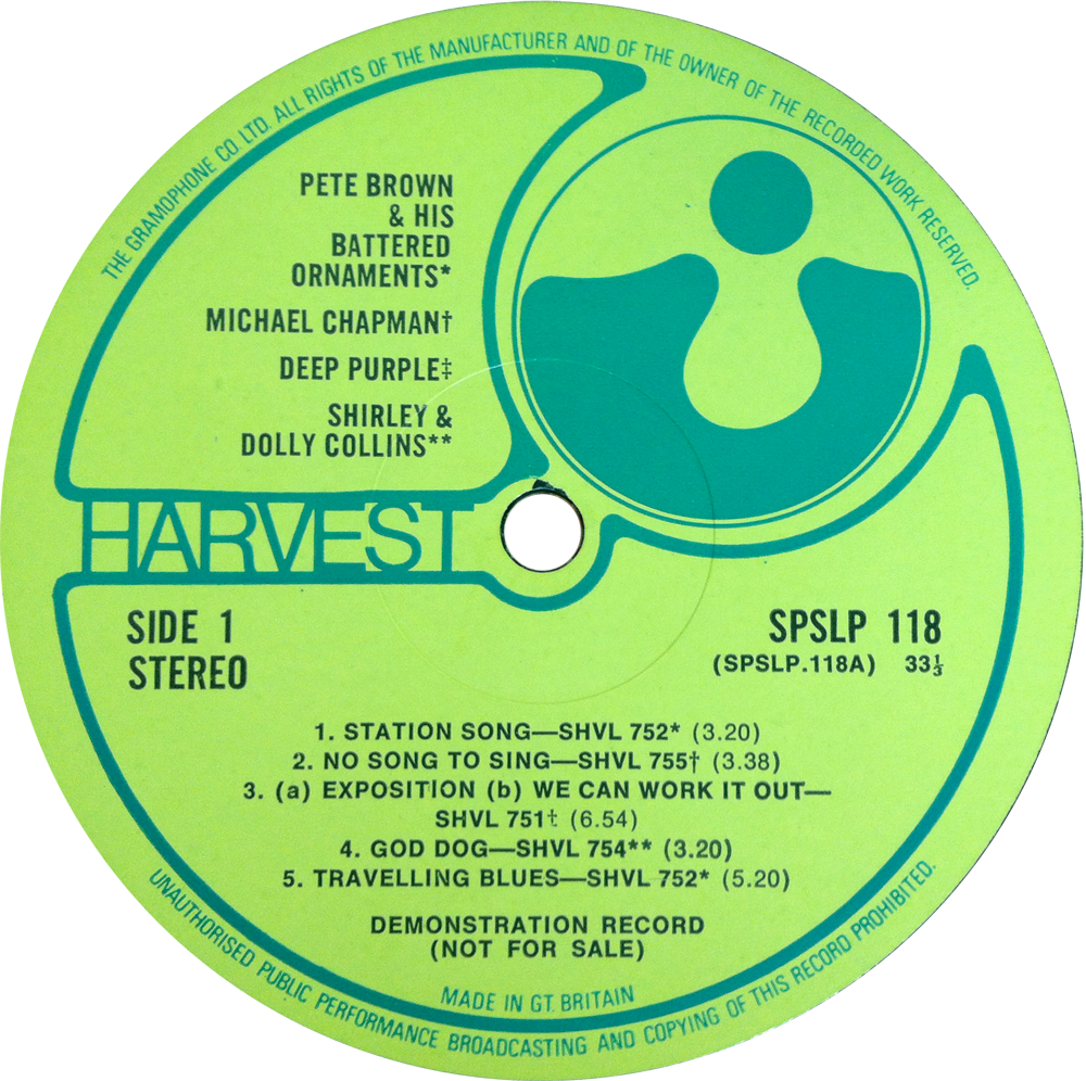 Steve wondered why SHVL753 had been omitted from the sample record and I can advise him that it is my belief that Panama Limited Jug Band’s album was not released until around September/October of 1969 (despite it having the third catalogue number in the sequence between Pete Brown’s SHVL752 and the Collinses’ SHVL754), thereby not being ready in time to be included on the sampler…