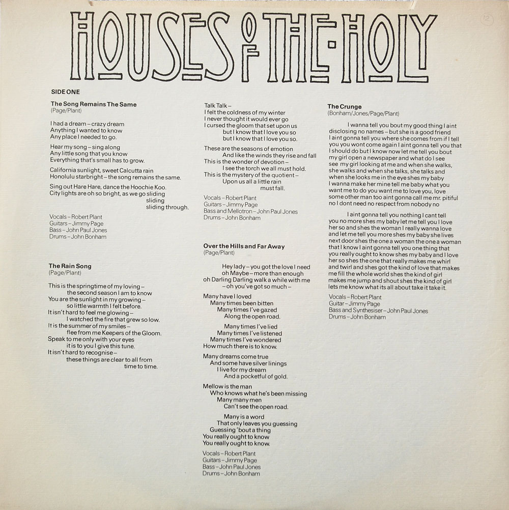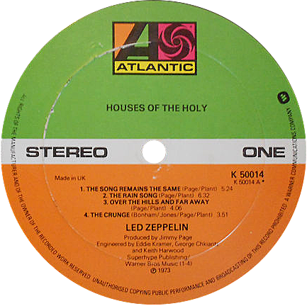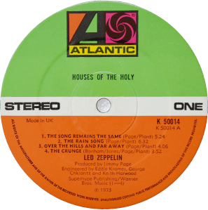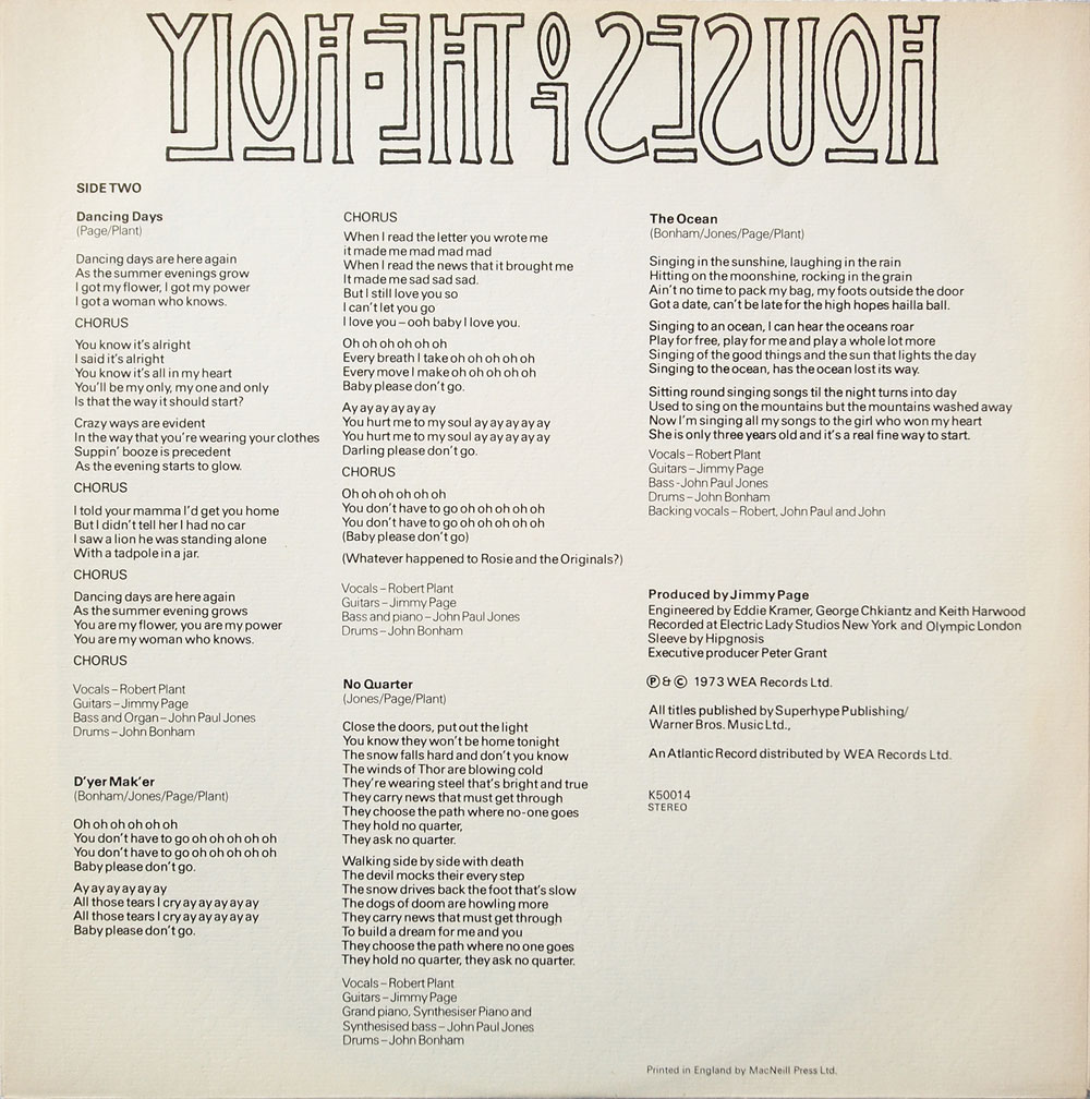No markings of any kind on the front, back or inner sleeve, nor the spine. Record company issued an ‘obi’ style strip to identify the band and album title (against Page’s wishes).