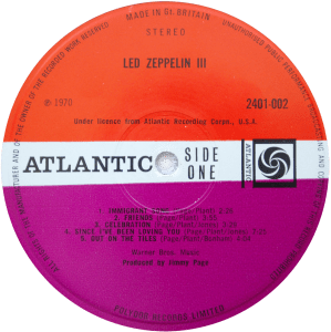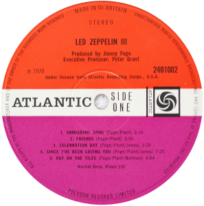the later issue also mis-names track 2 as ‘Celebration’ instead of ‘Celebration Day’ as well as deleting the Peter Grant credit and moving Jimmy Page’s producer credit into the lower ‘plum’ segment. The publishing credit has also dropped the ‘Ltd’ from Warner Bros. Music.