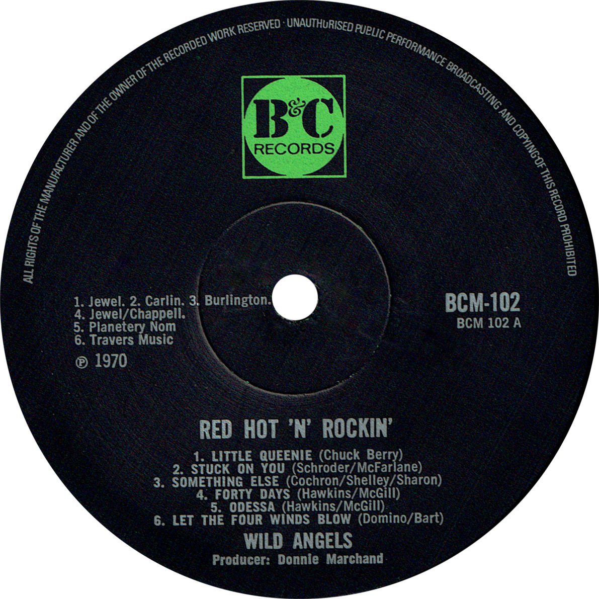 BCM 102 – Wild Angels “Red Hot ‘N’ Rockin'” 1970 Sleeve notes:Gatefold sleeve printed by EJ Day Group. Designed by Davis, Berney. Photography by Michael Pattison. Label notes:Rough textured label. Stamped matrix:BCM 102 A-2UBCM 102 B-2U Share this: Email a link to a friend (Opens in new window) Email Share on Facebook (Opens in new window) Facebook Share on X (Opens in new window) X Like Loading...