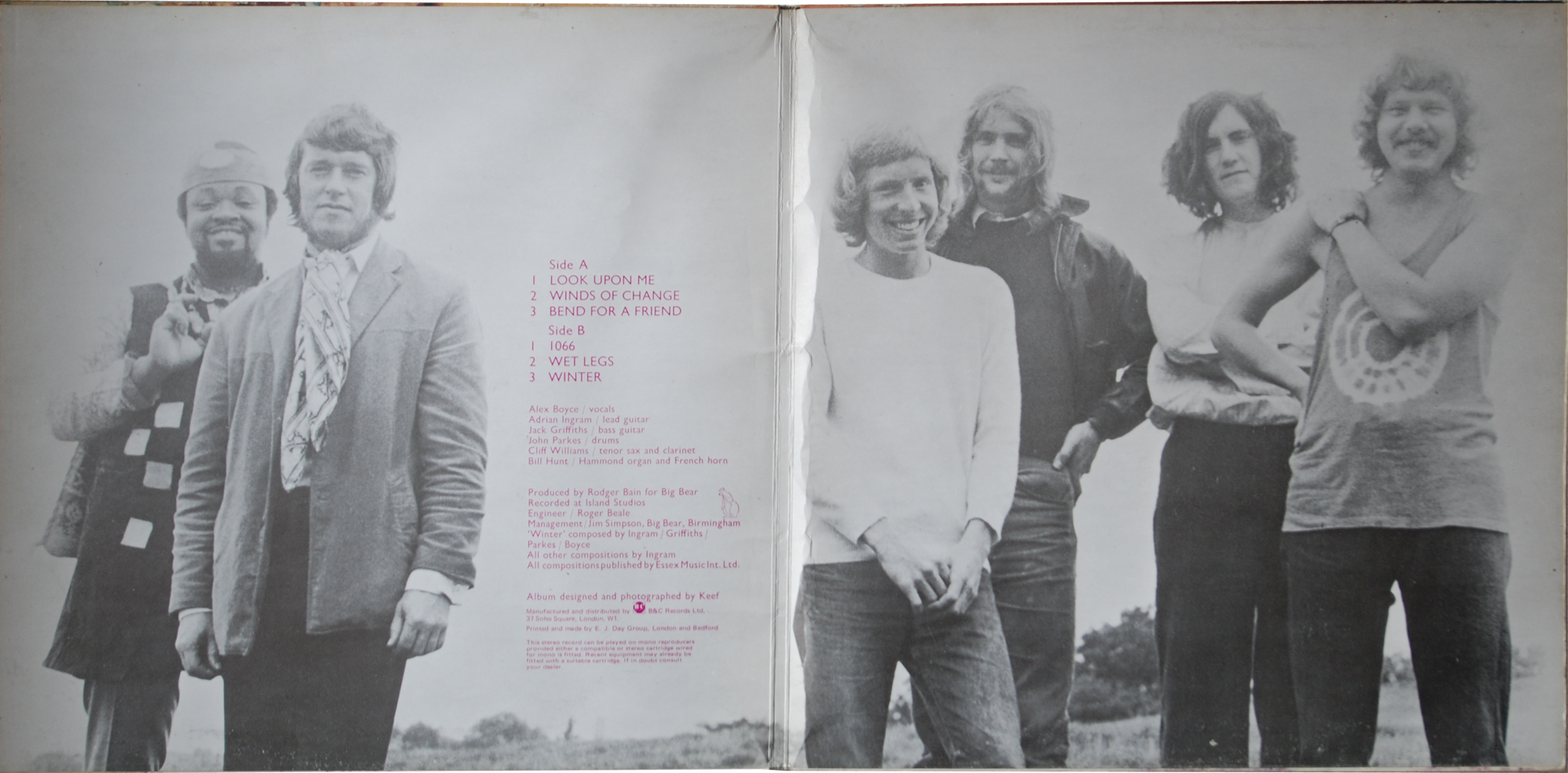 Gatefold sleeve designed and photographed by Marcus Keef (see Black Sabbath’s ‘Paranoid’ and compare the similar style and typography on the inner gatefolds). Printed and made by EJ Day Group. Credit to Jim Simpson of Big Bear Management, Birmingham (same as 1st pressings of ‘Paranoid’). Production credit to Rodger Bain (again, as per Sabbath)
