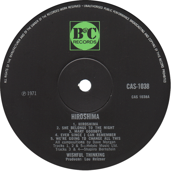 CAS 1038 – Wishful Thinking “Hiroshima” 1971 Sleeve Notes: Non gatefold sleeve., printed and made by EJ Day Group. Label Notes: Small B&C logo. Smooth label. A Side Matrix: C A S 1 0 3 8 A – 1 U B Side Matrix: C A S 1 0 3 8 B – 1 U Share this: Click to email a link to a friend (Opens in new window) Email Click to share on Facebook (Opens in new window) Facebook Click to share on X (Opens in new window) X Like Loading...