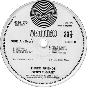 Two versions exist of Gentle Giant’s “Three Friends” album issued on the highly collectible Vertigo Swirl label. The first press small swirl label features an error in the song title of track 1, side 2: listed as ‘Feel The Paint’ when it should be ‘Peel The Paint’. Virtually identical in style, the 6360 070 label design features ‘Made In England’ in the top right of the label on the 2nd issue label and the song title error is corrected.