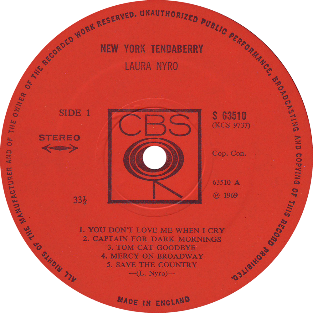 CBS 63510 – Laura Nyro “New York Tenderberry” 1969 Sleeve notes: Gatefold sleeve printed by EJ Day Group. Stamped matrix: SBPG 63510-A1 SBPG 63510-B1 Share this: Email a link to a friend (Opens in new window) Email Share on Facebook (Opens in new window) Facebook Share on X (Opens in new window) X Like Loading...