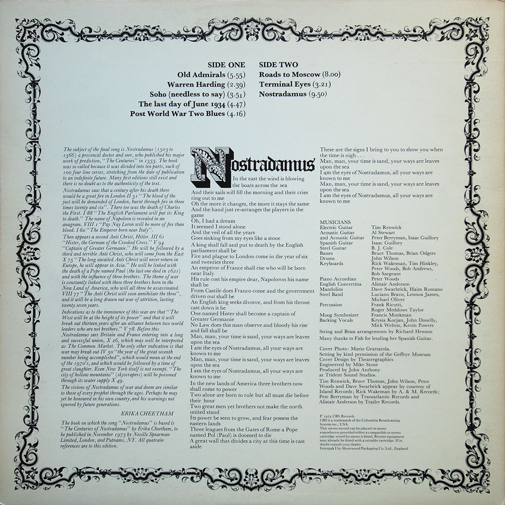 CBS 65726 – Al Stewart “Past, Present And Future” 1973 Sleeve notes: Gatefold sleeve printed by Shorewood Packaging. Stamped matrix: S 65726 A2 S 65726 B3 Share this: Click to email a link to a friend (Opens in new window) Email Click to share on Facebook (Opens in new window) Facebook Click to share on X (Opens in new window) X Like Loading...