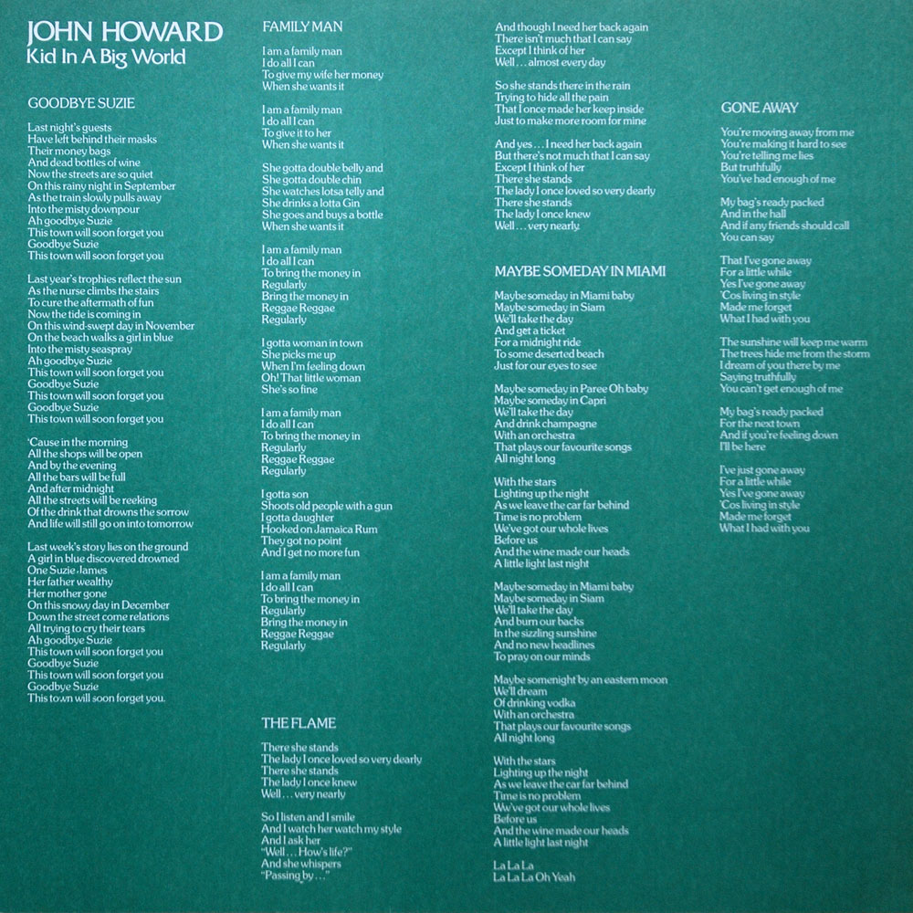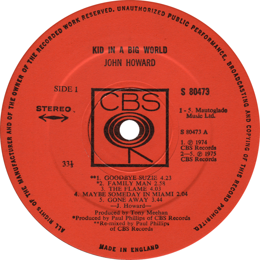 CBS 80473 – John Howard “Kid In A Big World” 1975 Sleeve notes: Non-gatefold sleeve printed by Shorewood Packaging. Comes with lyric insert. Share this: Click to email a link to a friend (Opens in new window) Email Click to share on Facebook (Opens in new window) Facebook Click to share on X (Opens in new window) X Like Loading...