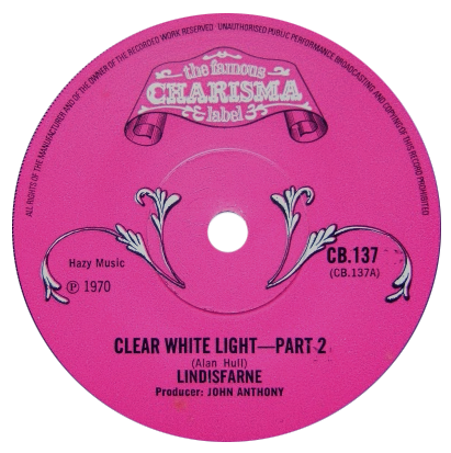 CB 137 – Lindisfarne “Clear White Light” 1970 Stamped matrix: C B 1 3 7 A – 2 U C B 1 3 7 B – 1 U Reissued with B&C credit label. Share this: Email a link to a friend (Opens in new window) Email Share on Facebook (Opens in new window) Facebook Share on X (Opens in new window) X Like Loading...