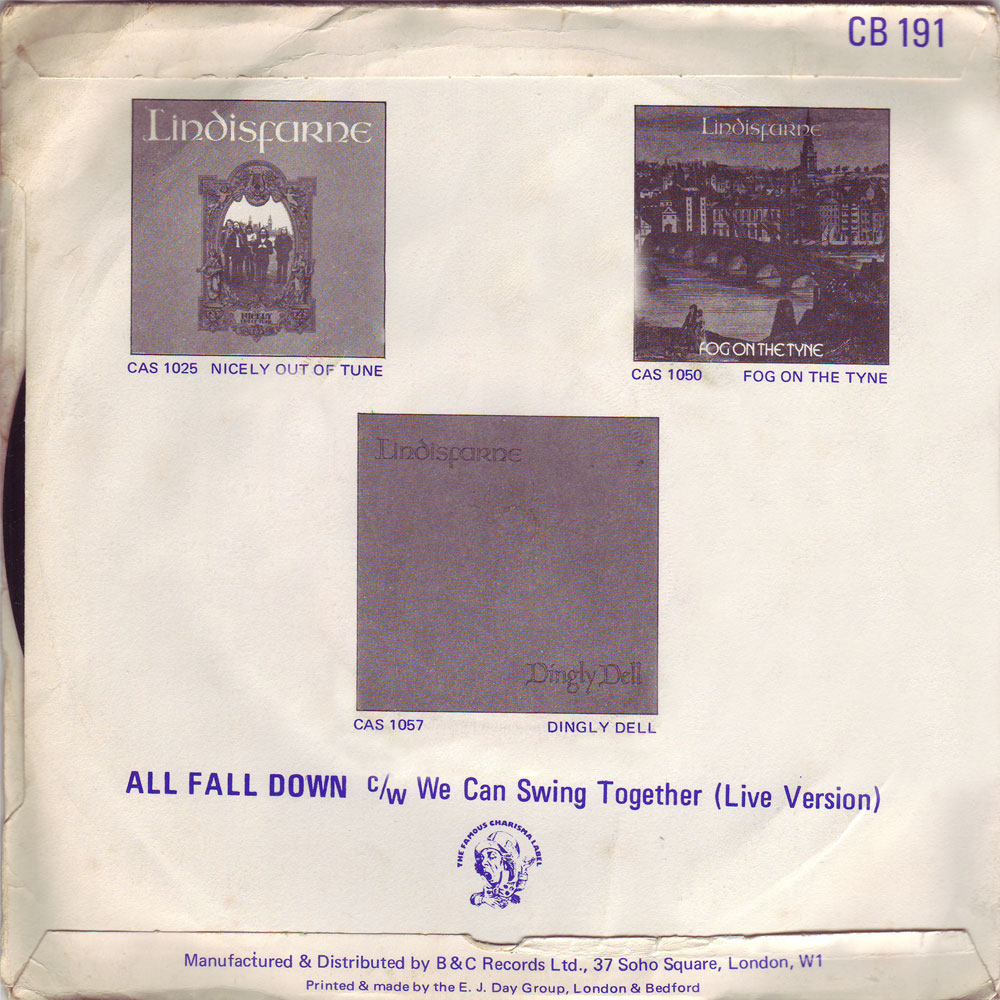 CB 191 – Lindisfarne “All Fall Down” 1972 Smooth label with B&C Records credit. Some singles issued with picture sleeve. CB 191 A-3U CB 191 B-1U Share this: Email a link to a friend (Opens in new window) Email Share on Facebook (Opens in new window) Facebook Share on X (Opens in new window) X Like Loading...