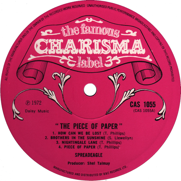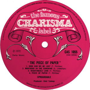 CAS 1055 – Spreadeagle “The Piece Of Paper” – 1972 Sleeve Notes: Non-gatefold sleeve. Printed by E.J. Day Group, London & Bedford. Label Notes: “MANUFACTURED AND DISTRIBUTED BY B&C RECORDS LTD.” on label. A Side Matrix: C A S 1 0 5 5 A – 1 U B Side Matrix: C A S 1 0 5 5 B – 1 U Share this: Email a link to a friend (Opens in new window) Email Share on Facebook (Opens in new window) Facebook Share on X (Opens in new window) X Like Loading...