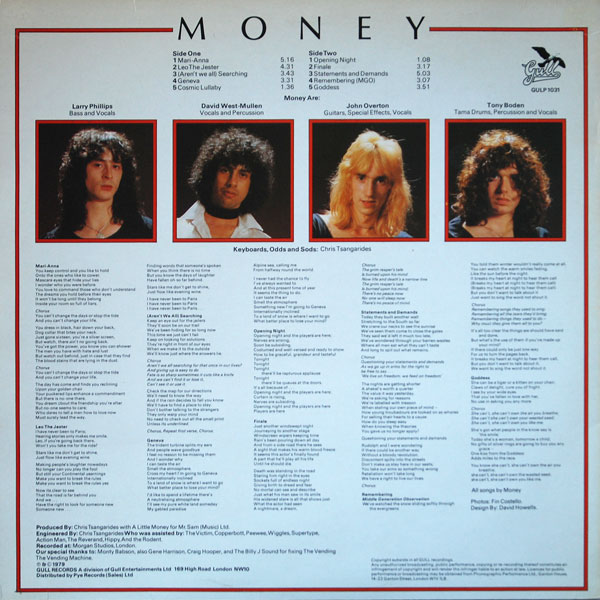 Money were a band from Birmingham UK. This LP had good reviews in the UK and very good response in Japan when Gull records or Morgan Studio’s through their publishing did a deal with Victor Japan. Not that the band knew any of this as they had effectively broken up when the news from Japan reached them. They released an EP ‘Another case of suicide’ on HOBO label which was another inhouse label of Morgan Studio’s. Money’s Leo The Jester appeared on a BBC compilation LP ‘Metal Explosion’ which featured session tracks from the Radio One Friday Rock Show. That apart from a ’45 with non LP b-side is their recorded output