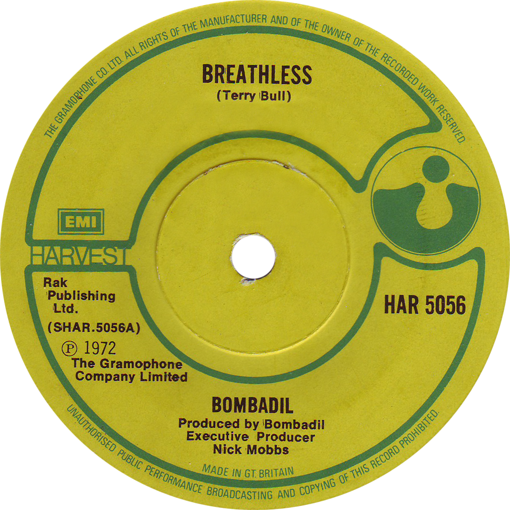 HAR 5056 – Bombadil “Breathless” 1972 Label notes: THE GRAMOPHONE CO. LTD around label rim MADE IN GT. BRITAIN at bottom centre With EMI logo. Share this: Click to email a link to a friend (Opens in new window) Email Click to share on Facebook (Opens in new window) Facebook Click to share on X (Opens in new window) X Like Loading...