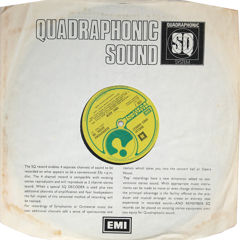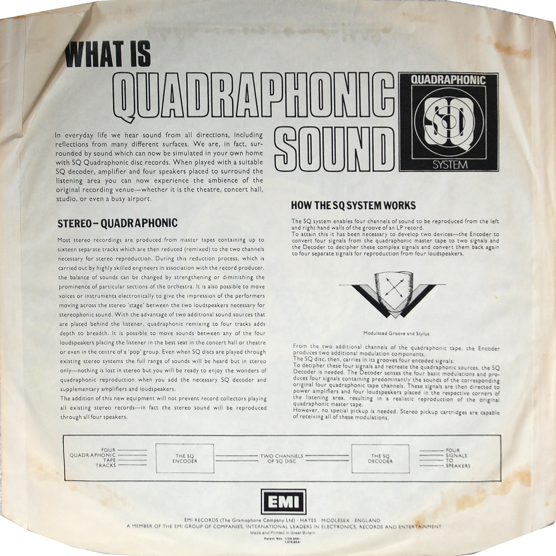 Laminated gatefold sleeve, date code 7210 (October 1972) and printer’s credit on rear gatefold – “Printed and made by Garrod & Lofthouse Ltd.” SQ and quadraphonic logos/lettering on front and rear. Inner gatefold is identical to stereo release.