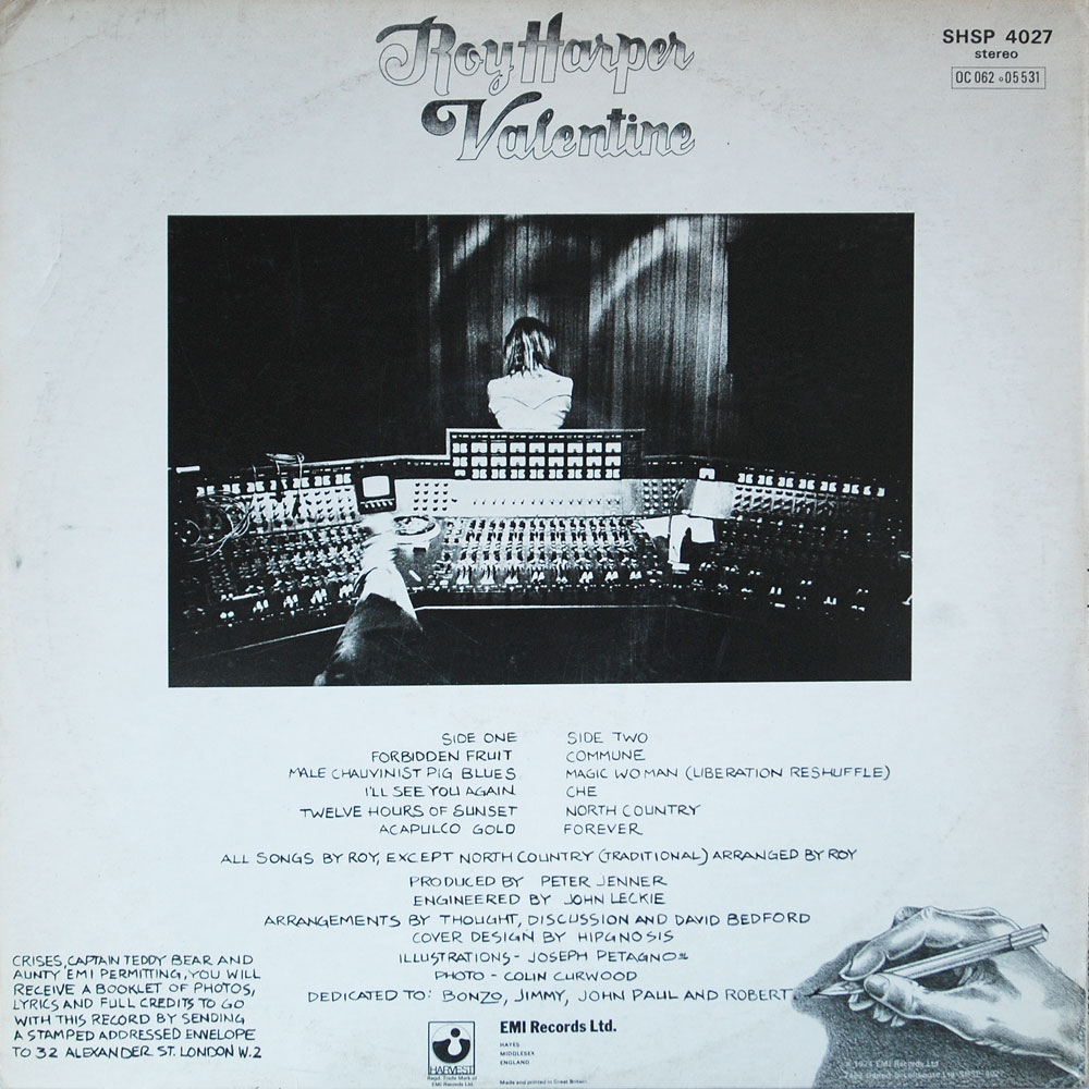 Non-gatefold sleeve printed by Garrod & Lofthouse with 7402 date code on rear (February 1974). Cover designed by Hipgnosis, illustration by Joe Pentagno, photography by Colin Curwood.