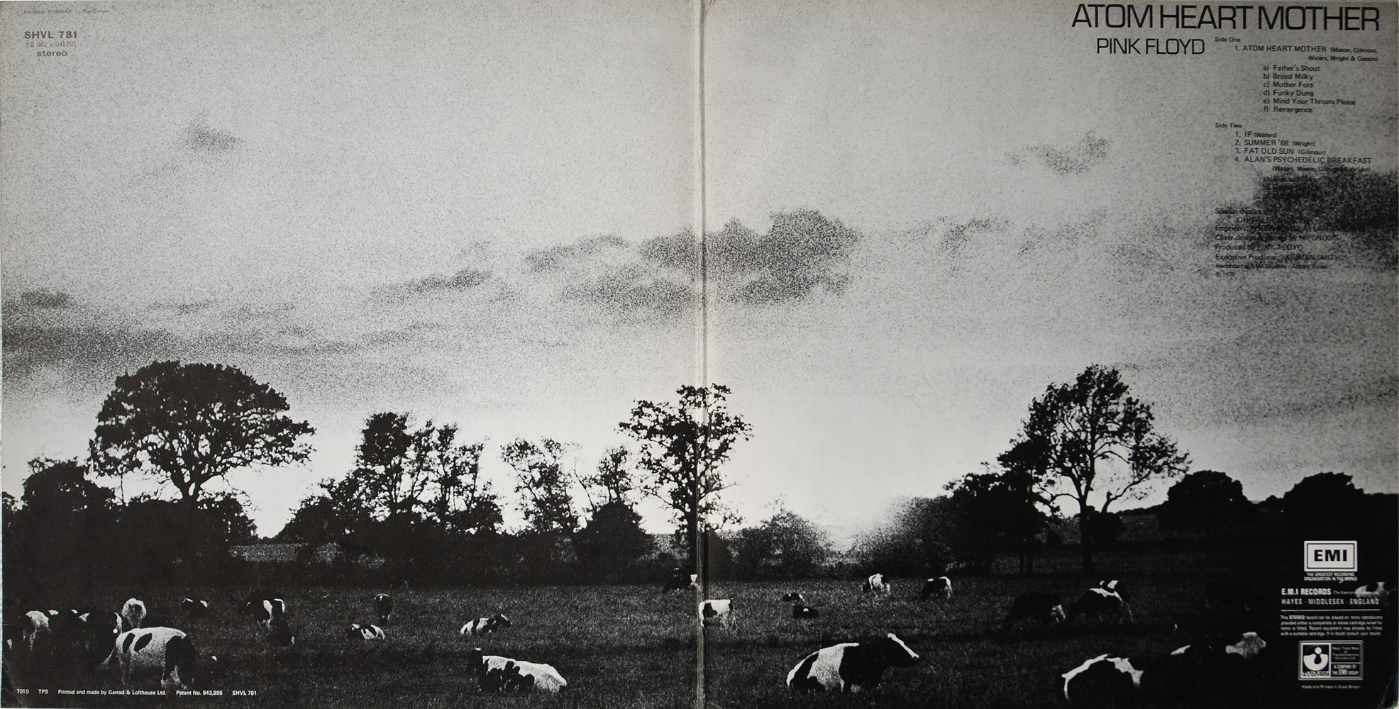 Unlaminated gatefold sleeve, designed by Hipgnosis, date code 7010 (October 1970) and printer’s credit on inner gatefold.