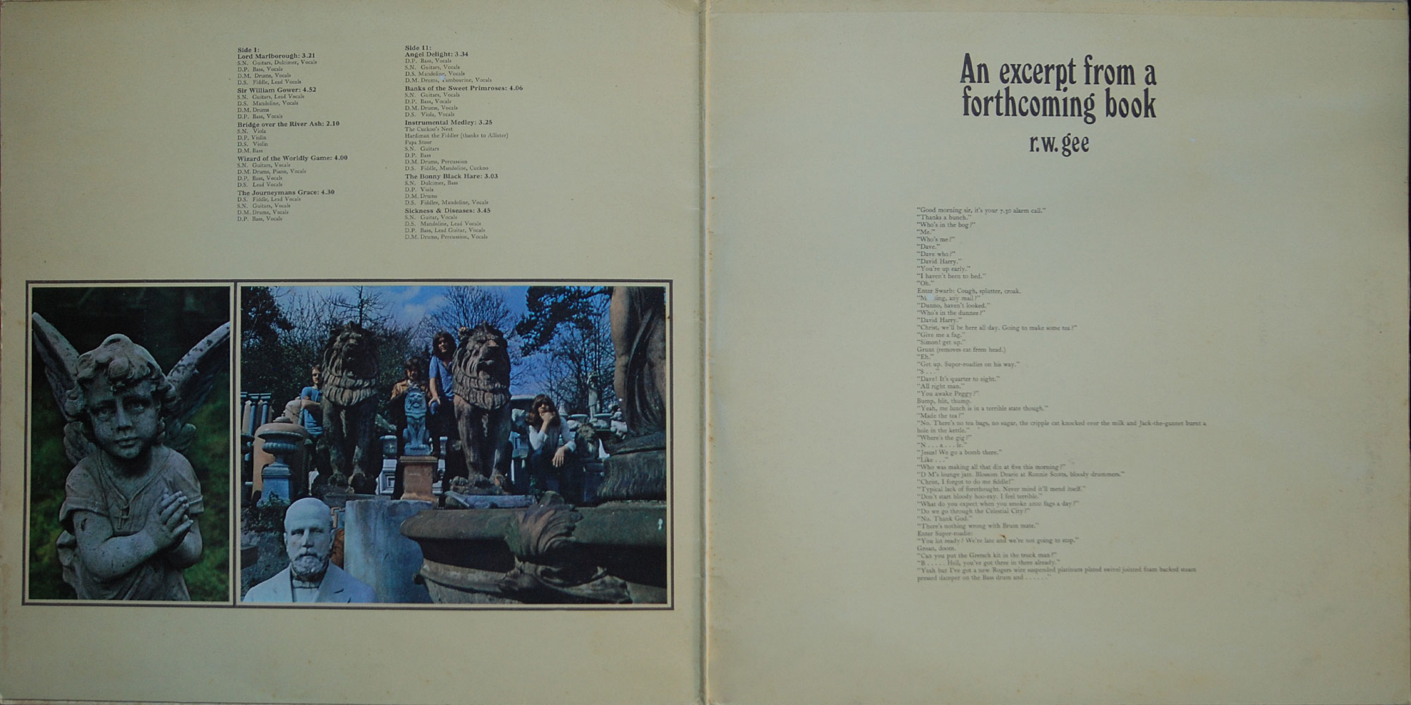 Rough texture matt outer sleeve with glossy photos glued onto front and rear. Inner gatefold is smooth. Printed by Howards Printers (credit on rear).