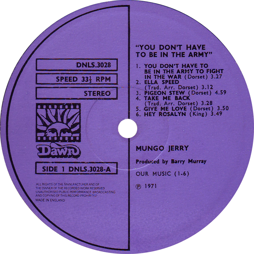 Dawn DNLS3028 – Mungo Jerry “You Don’t Have To Be In The Army” 1971 Sleeve notes: Gatefold sleeve opens vertically. Stamped matrix: DNLS 3028 A-1△G DNLS 3028 B-1△G Share this: Email a link to a friend (Opens in new window) Email Share on Facebook (Opens in new window) Facebook Share on X (Opens in new window) X Like Loading...