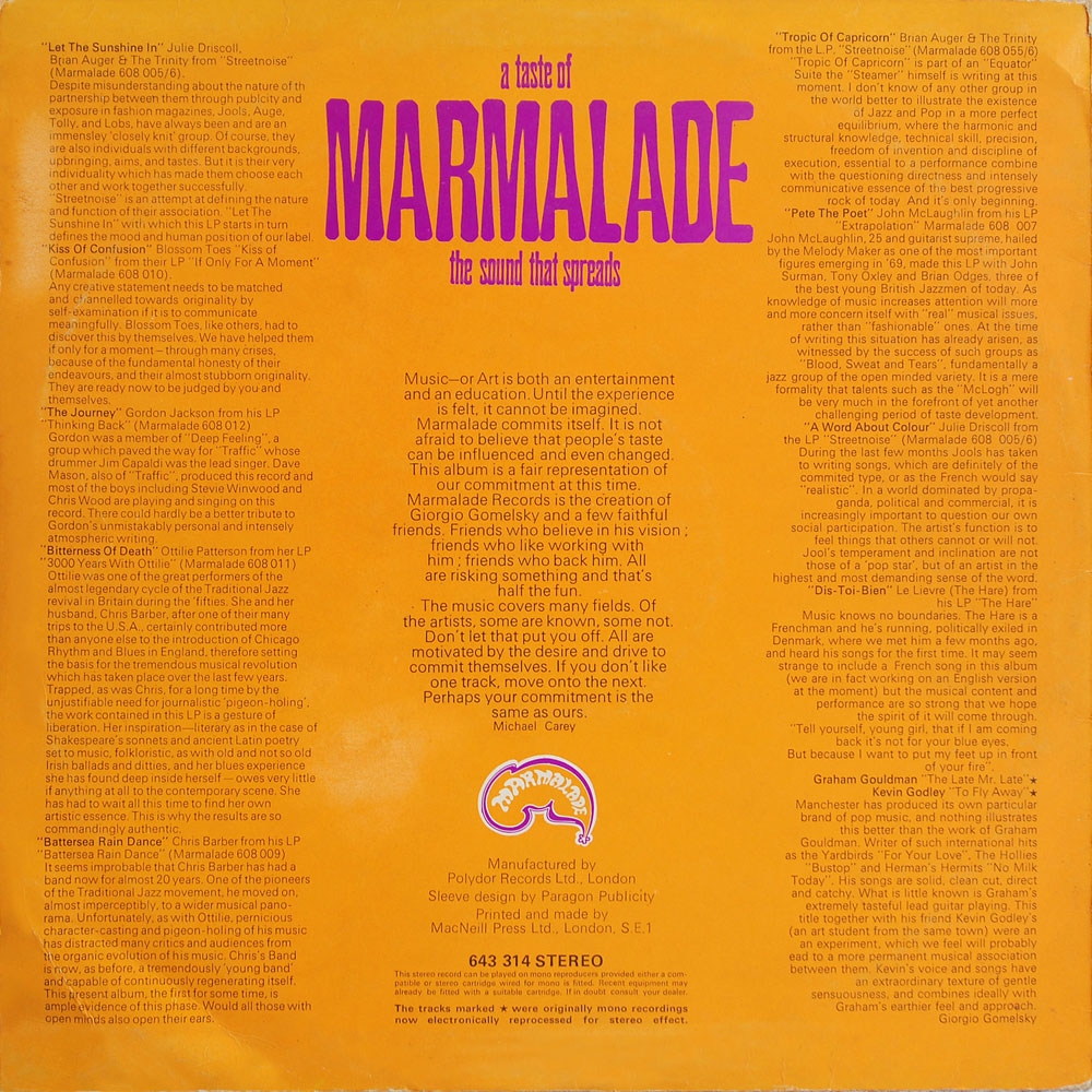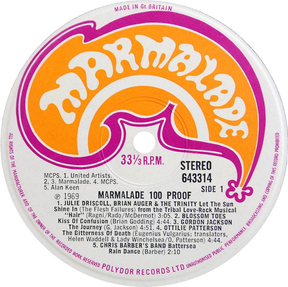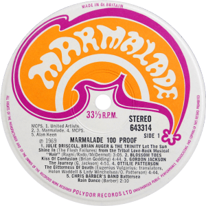 Rare label sampler from the shortlived ‘Marmalade’ label, manufactured and distributed by Polydor Records.