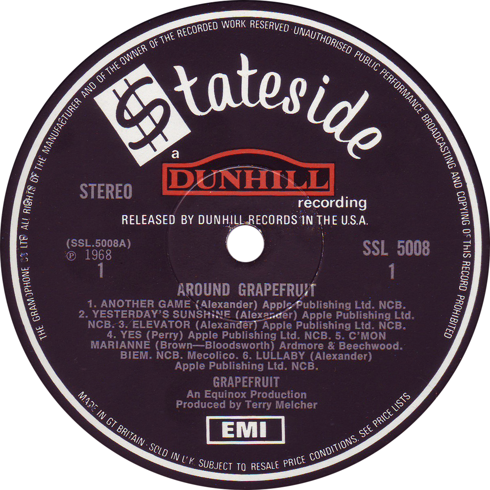 Stateside was part of the EMI Group so the label carries “THE GRAMOPHONE CO. LTD” and also the ‘SOLD IN THE UK SUBJECT TO RESALE PRICE CONDITIONS, SEE PRICE LISTS” wording.