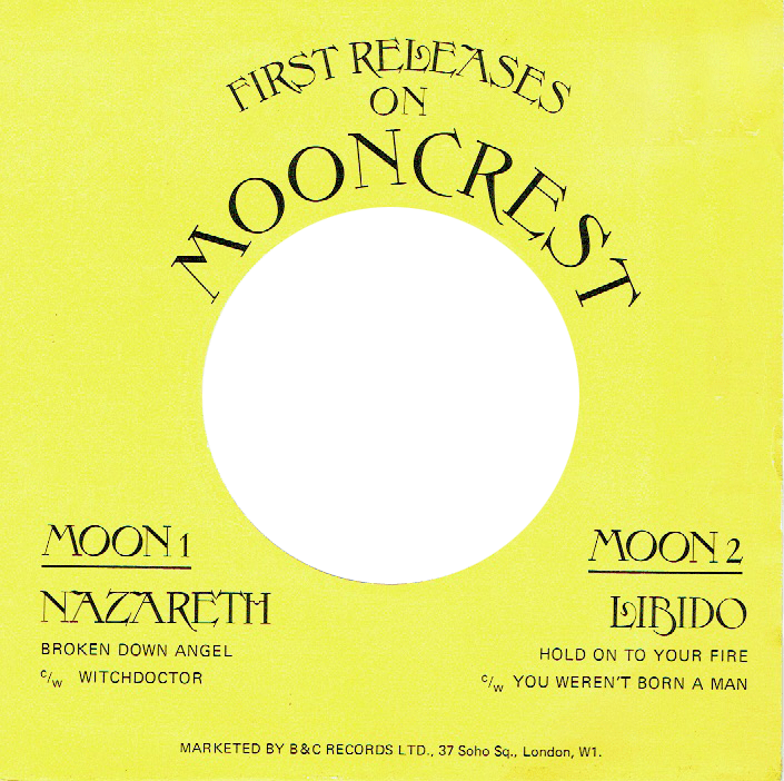 Most singles seem to have been released in plain black sleeves, no company sleeves or picture sleeves other than the first 2-3 singles, which were issued in a yellow Mooncrest sleeve advertising MOON 1 and MOON 2 (Nazareth and Libido). It’s possible this sleeve was used for additional, later releases until the label was established.