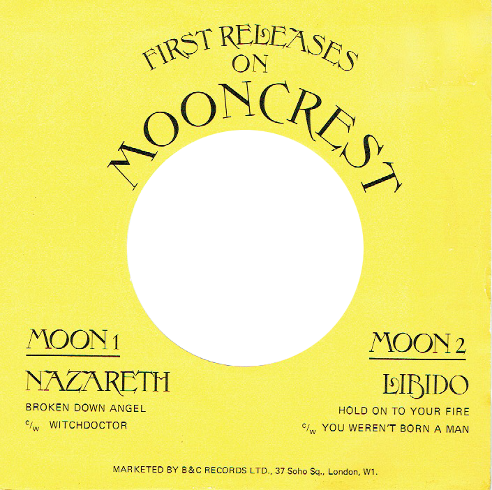 Most singles seem to have been released in plain black sleeves, no company sleeves or picture sleeves other than the first 2-3 singles, which were issued in a yellow Mooncrest sleeve advertising MOON 1 and MOON 2 (Nazareth and Libido). It’s possible this sleeve was used for additional, later releases until the label was established.