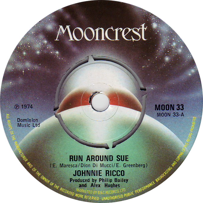 MOON 33 – Johnnie Ricco “Run Around Sue” 1974 Stamped matrix: MOON 33 A-1U MOON 33 B-1U Share this: Click to email a link to a friend (Opens in new window) Email Click to share on Facebook (Opens in new window) Facebook Click to share on X (Opens in new window) X Like Loading...
