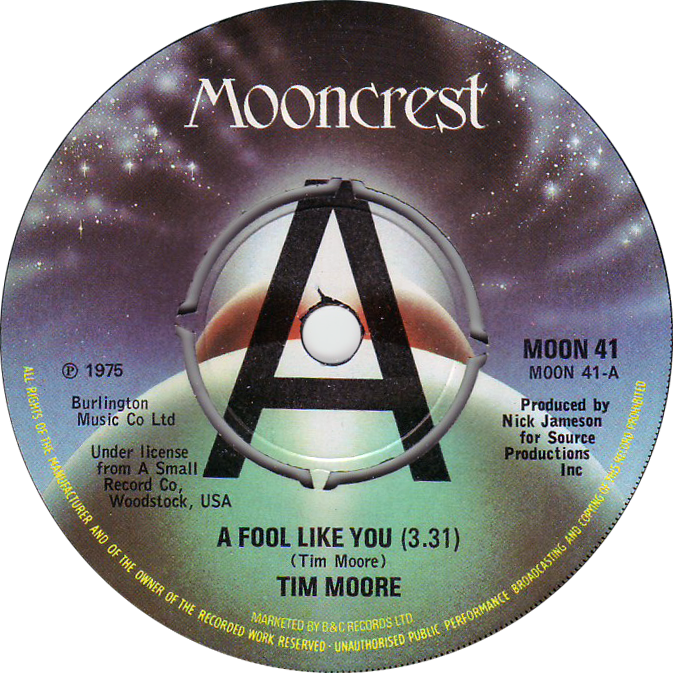 MOON 41 – Tim Moore “A Fool Like You” 1975 Stamped matrix: MOON 41 A-1U MOON 41 B-1U Share this: Email a link to a friend (Opens in new window) Email Share on Facebook (Opens in new window) Facebook Share on X (Opens in new window) X Like Loading...