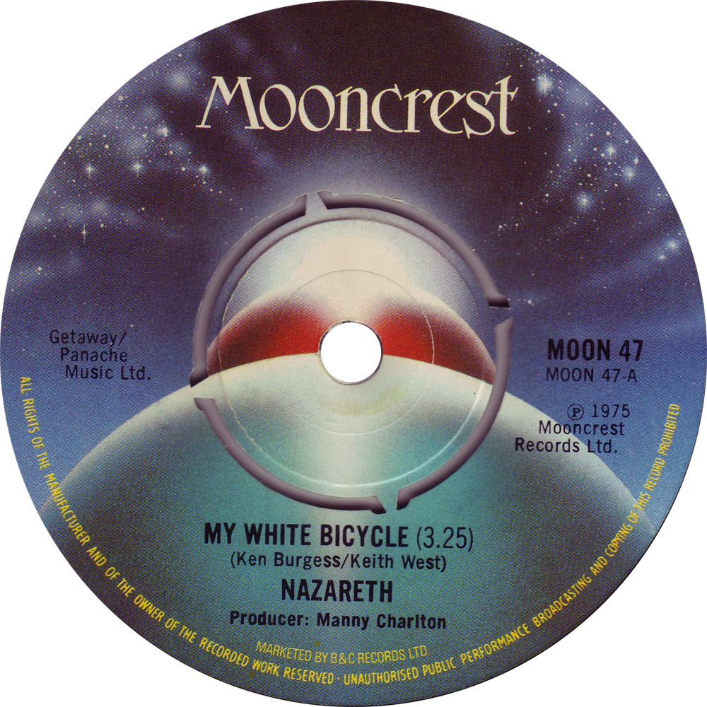 MOON 47 – Nazareth “My White Bicycle” 1975 Stamped matrix: MOON 47 A-1U MOON 47 B-1 Share this: Email a link to a friend (Opens in new window) Email Share on Facebook (Opens in new window) Facebook Share on X (Opens in new window) X Like Loading...