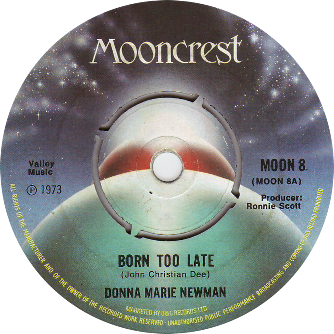 MOON 8 – Donna Marie Newman “Born Too Late” 1973 Stamped matrix: MOON 8 A-1U MOON 8 B-1U Share this: Click to email a link to a friend (Opens in new window) Email Click to share on Facebook (Opens in new window) Facebook Click to share on X (Opens in new window) X Like Loading...