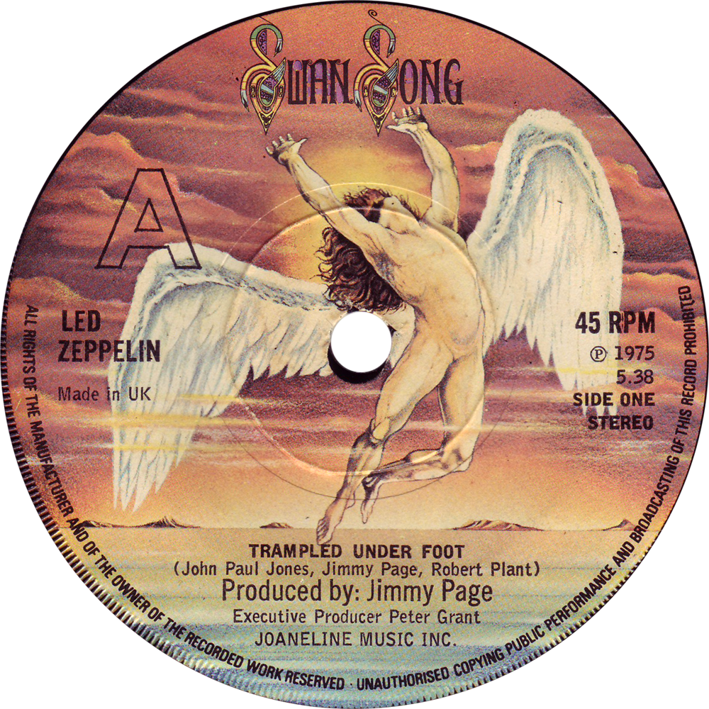 Song title appears as two words, thus: “Trampled Underfoot” on the album, but the single version has it incorrectly as three words, thus: “Trampled Under Foot”
