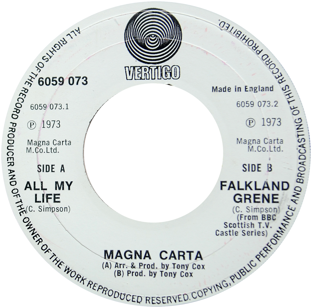 6059 073 – Magna Carta “All My Life” 1973 Released 2nd February 1973 Matrix: 6059073 1F//1 420 1 1 3 04 6059073 2F//1 420 1 1 3 04 Share this: Click to email a link to a friend (Opens in new window) Email Click to share on Facebook (Opens in new window) Facebook Click to share on X (Opens in new window) X Like Loading...