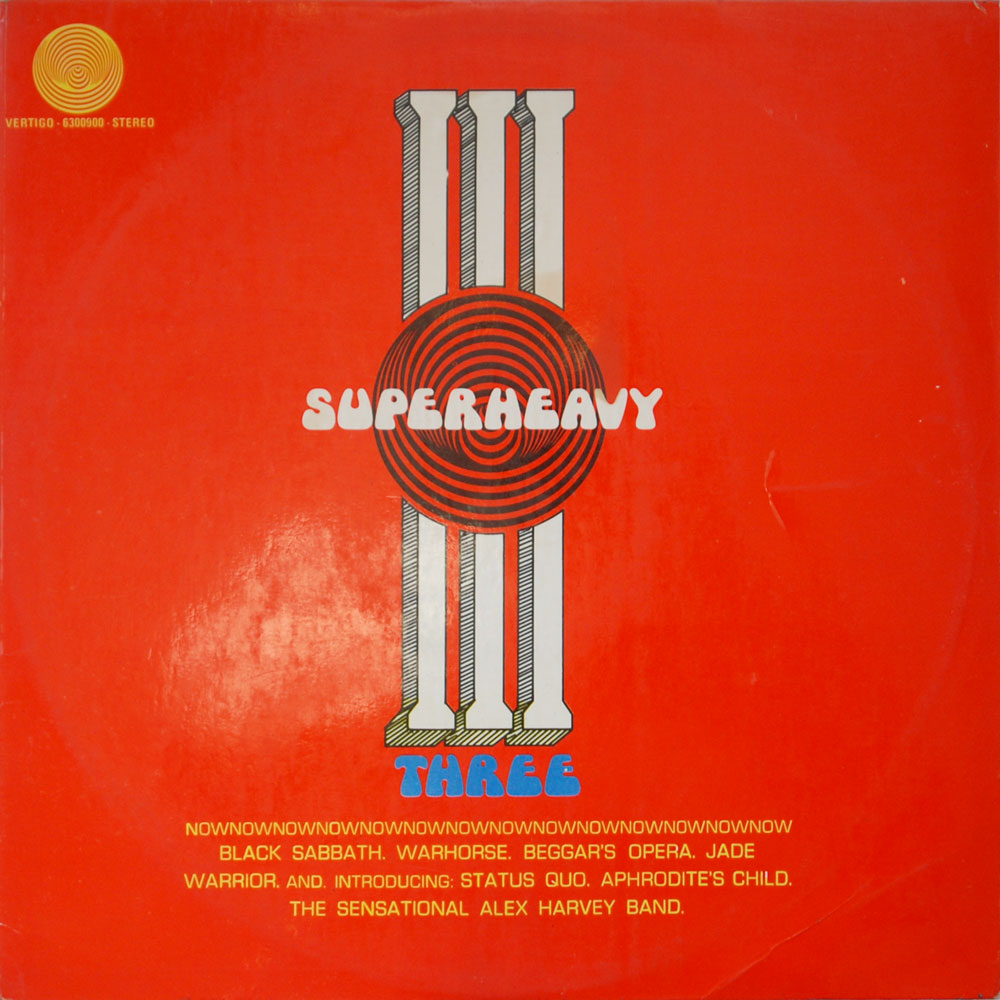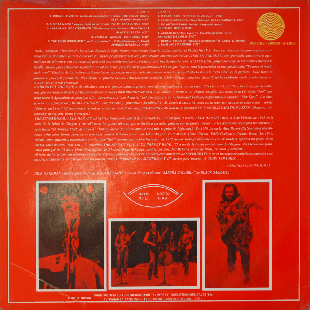 The previous two ‘Superheavy’ samplers from Peru managed to utilise unissued catalogue numbers from the UK, this third and final compilation though uses a 6300 900 number and is only included here for the sake of being ‘completist’, i.e. if you’ve decided to collect the full series of UK catalogue numbers you’ve probably collected (or want to collect) the previous two ‘Superheavy’ albums…and therefore you’ll need this third one too! Given that it features two tracks from Black Sabbath’s ‘Sabbath Bloody Sabbath’ album it probably came out in late ’73 or 1974.