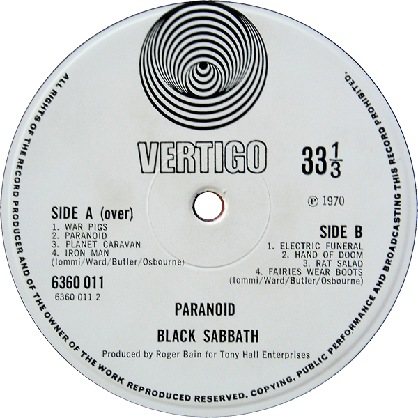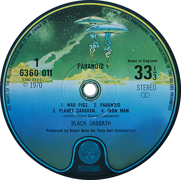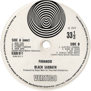 This label design was used for both the first issue (with Big Bear credit – see notes above) and the second issue (with Big Bear credit removed from the inner gatefold). There are two further swirl reissues (with a laminated gatefold sleeve) with the smaller swirl logo and VERTIGO above the spindle – see labels below – and then the final Vertigo reissue on the spaceship label – possibly rarer than some swirl versions.