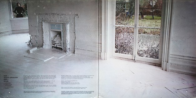 Yet another bizarre concept from Keef! The interior of an empty (derelict?) house has been painted entirely in white, including 2 remaining occupants! A strangely dressed mother and child sit in a rocking chair looking wistful. Printer’s credit on inner gatefold: