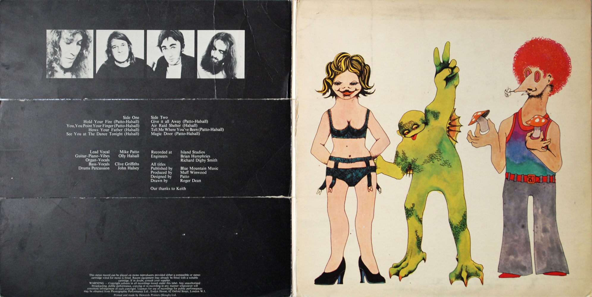 One of the more unusual Vertigo sleeve designs and difficult to find intact. The gatefold sleeve has the front cover divided into 3 horizontal strips which can be alternated to give a different resulting image when overlaid on the illustrations below. Illustration by Roger Dean.