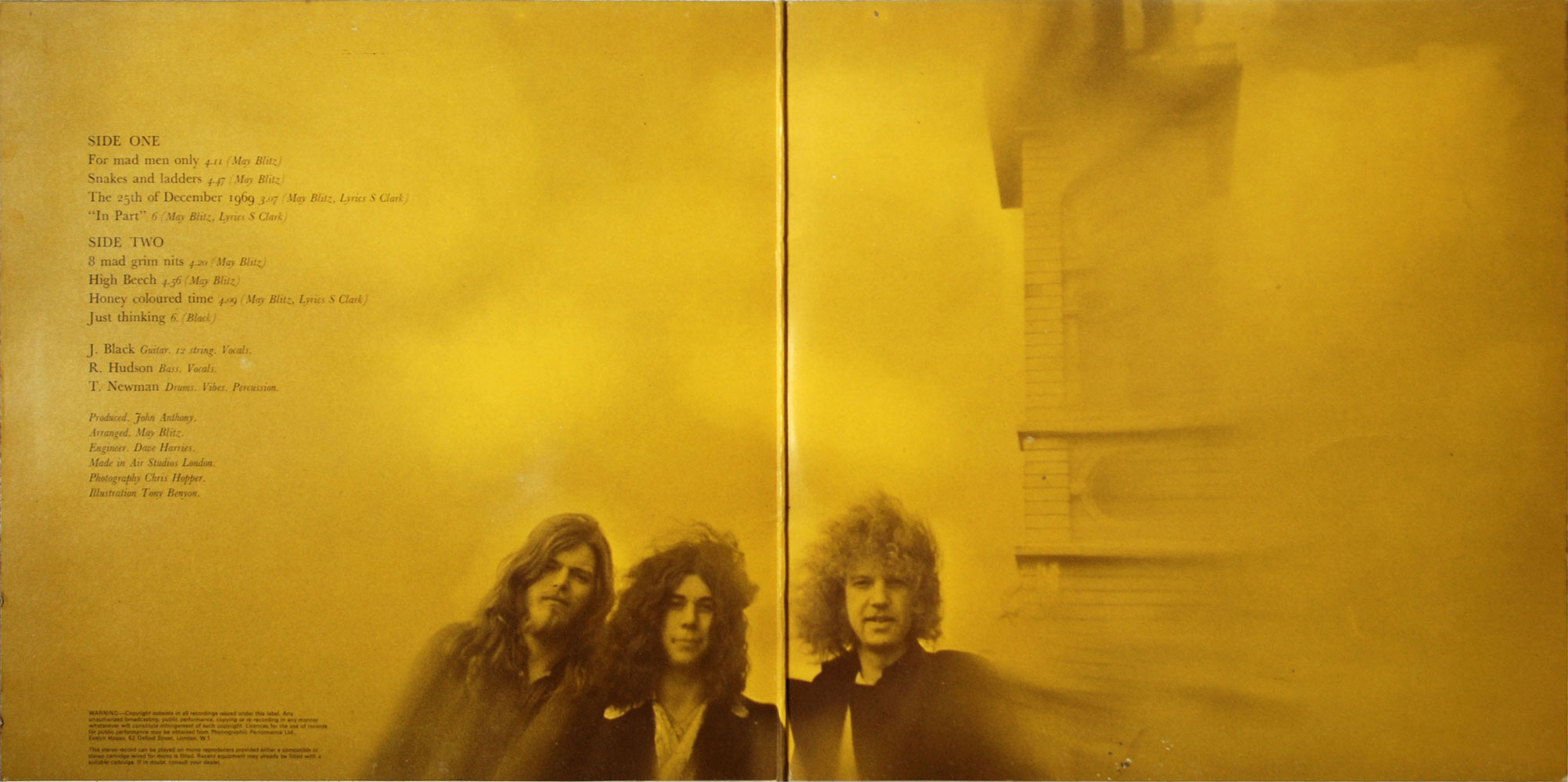 Gatefold sleeve with front cover illustration by Tony Benyon and inner sleeve photography by Chris Hopper. No printer’s credit.