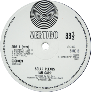 Small swirl logo and VERTIGO above spindle hole. There is a large swirl logo version too but this has hand etched matrices (which is highly unusual for Vertigo swirls…is it a genuine UK pressing?).