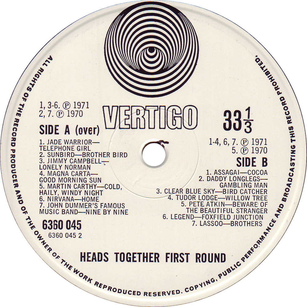 6360 045 – Various “Heads Together First Round” 1971 Sleeve notes: Textured gatefold sleeve (same type of textured pattern as Tudor Lodge). Share this: Email a link to a friend (Opens in new window) Email Share on Facebook (Opens in new window) Facebook Share on X (Opens in new window) X Like Loading...