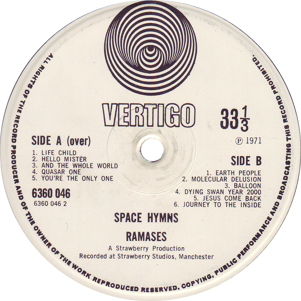 Small swirl and VERTIGO above spindle hole. Reissued on the Spaceship label.