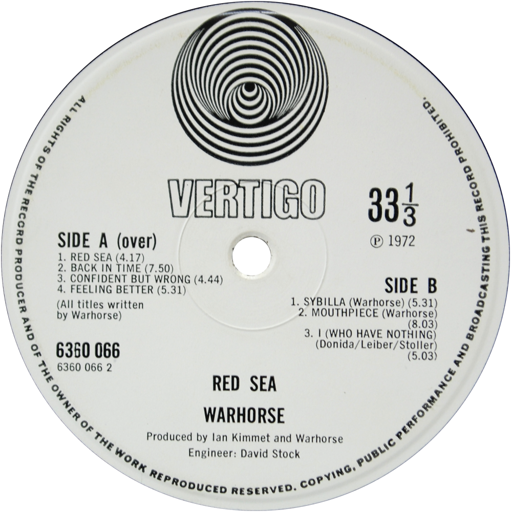Small swirl and VERTIGO above spindle. Two versions exist, track listing on the left version above takes up more space, whilst the version on the right has all the song timings on the same line as the song title.