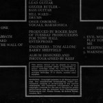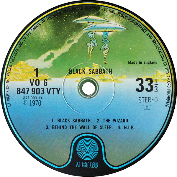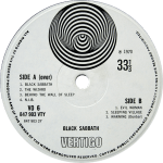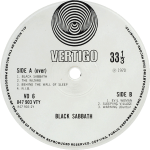 Gatefold sleeve. Three versions of the sleeve exist. The first issue had an erroneous copyright warning stating that “Copyright subsists in all Stereo recordings…”. The 2nd version corrected this to “Copyright subsists in all Vertigo recordings…”. Both these versions had band member and production credits in capital letters throughout. The third version of the sleeve changed all credits into upper and lower case and also adds in composition and publishing credits. All versions (including subsequent reissues) all mis-spell Ozzy Osbourne as Ossie Osborne.