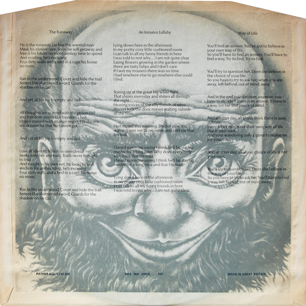Non-gatefold, textured outer sleeve with die cut opening and clear PVC printed ‘window’. Comes with a heavy card insert printed on one side with additional band members – creates a ‘layered’ effect when inserted into front sleeve. Also comes with a thin paper lyric inner sleeve.