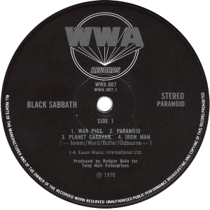 Silver WWA logo. Catalogue number in centre above spindle hole. Original Vertigo stamped matrix visible and hand-etched WWA matrix.