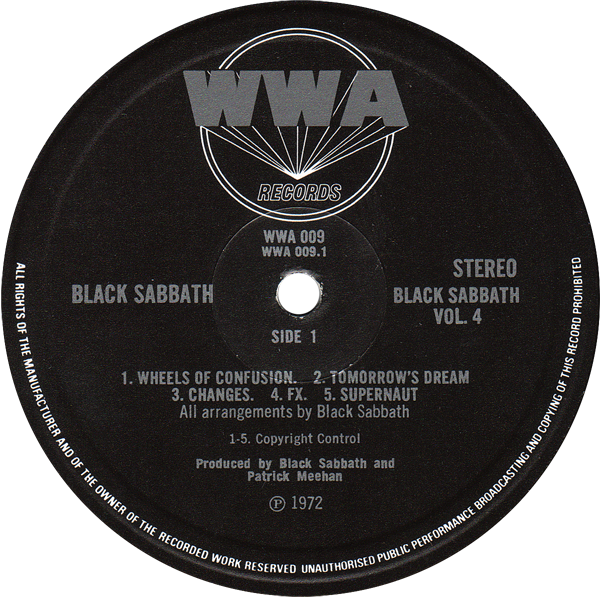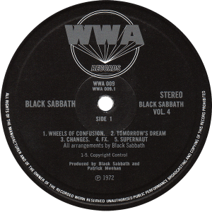 WWA009 – Black Sabbath “Black Sabbath Vol.4” 1972 – reissued 1974 Sleeve notes: Gatefold sleeve with bound in booklet, printed by Howards Printers. Share this: Email a link to a friend (Opens in new window) Email Share on Facebook (Opens in new window) Facebook Share on X (Opens in new window) X Like Loading...